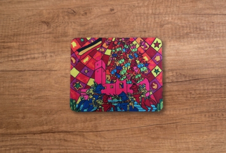 Knallig buntes Mousepad mit Abbildung der Königsteiner Burg und Rittern.