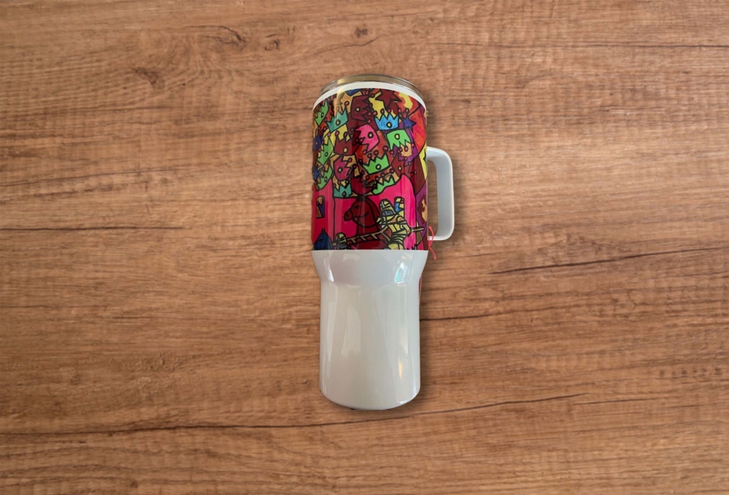 Knallig bunter Thermo-Trinkbecher mit Henkel (groß) mit Abbildung der Königsteiner Burg und Rittern.